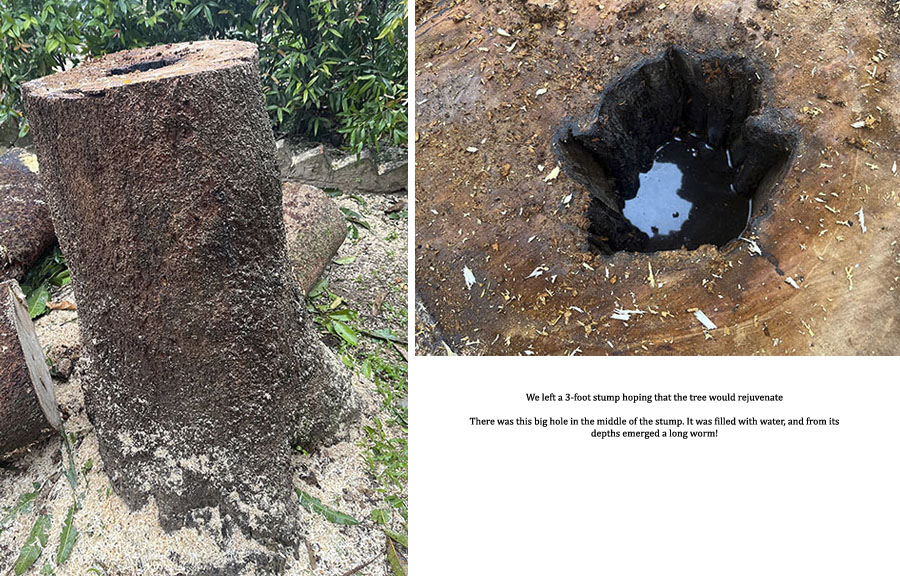 Every summer the tree bore big, beautiful looking mangoes but they were much too high to reach, so the squirrels and birds would feast on them! Then some fruit would fall to the ground, but we found that many were infested with black worms, and quite rotten. Our tree was clearly diseased and in great distress. We tried all sorts of treatments but nothing worked